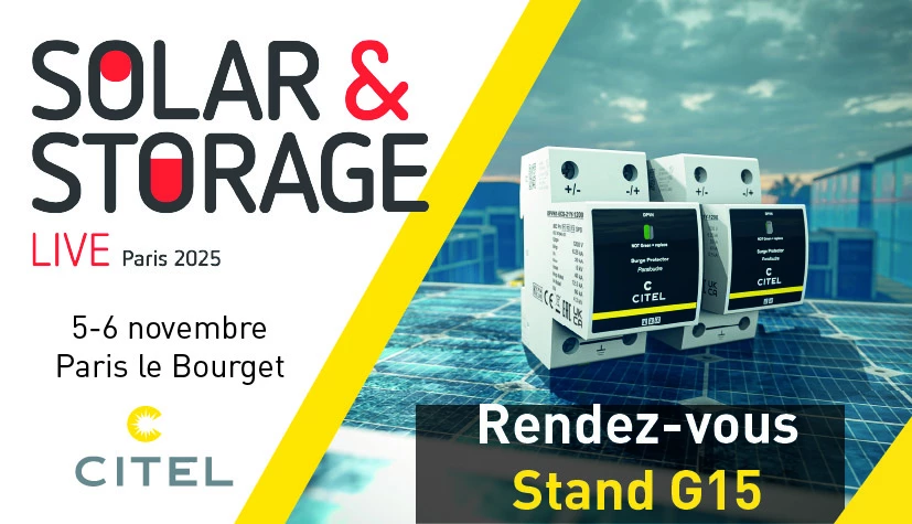 🚨 Nous vous attendons sur Solar&Storage Paris 👉 Venez découvrir nos solutions de protection contre les surtensions dédiées aux installations solaires photovoltaïques et de stockage d’énergie. Nos experts seront présents pour échanger sur : 🔹 La fiabilité et la sécurité des installations PV 🔹 Les dernières innovations CITEL en parafoudres DC et AC 🔹 Les bonnes pratiques pour une protection optimale de vos équipements 📍 Stand G15 📅 5 & 6 novembre 2025 📌 Solar & Storage Paris – Le Bourget Demander son badge